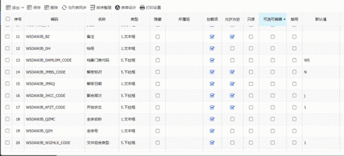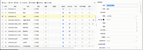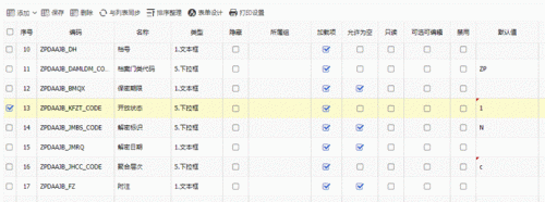 在这里以”保管期限“为例,介绍如何配置”保管期限“的默认值为永久。在菜单”业务配置“上,我们可以看到,保管期限一般有3个选项,分别为永久、30年和10年,其值分别为Y、D30、D10,可在表单选项的列表中,找到“保管期限”的字段名称,可见与保管期限有关的字段有两个,字段WSDAWJB_BGQX_NAME和字段WSDAWJB_BGQX_CODE,有NAME标志的字段负责显示汉字,其字段类型是文本型,有CODE字样的字段负责管理编码,其控件类型是下拉框,示例如下表,我们只需在WSDAWJB_BGQX_NAME所在的行的默认值中输入“Y”即可。