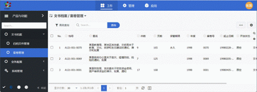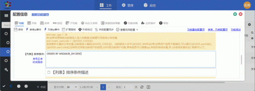 点击齿轮图标,会显示一个功能选项菜单,从中选择“功能配置”菜单,进入整个列表的配置页面,向下移动鼠标,在“列表排序条件”一栏中,会看到现有的排序条件“ORDER BY WSDAAJB_DH DESC”,意思是按文书档案案卷表的档号字段逆序排序,如果用户想顺序排列,去掉“DESC”,点击保存按钮退出窗口,再点击一下齿轮,在菜单最下部点击即可,刷新一下,即可看到以档号为序由小到大排列的案卷目录。按照这个思路,配置员可以为档案员配置出以任意字段为序的案卷目录列表。