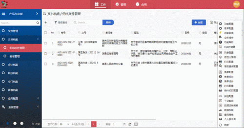 设置字段的默认值,需要以配置员身份登陆软件,在每个菜单的列表设置中进行。以文书档案归档文件管理为例,点击菜单,进行文书档案的归档文件管理,在列表界面上,点击软件右上角的齿轮标志,这时,齿轮的工具文本显示“开发选项”,表明可进入配置窗口,如下图。