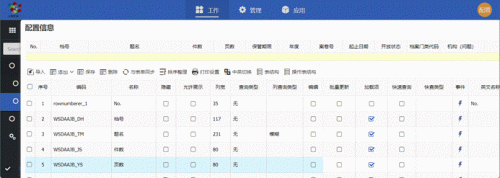 用户进入某个门类档案的管理界面后,首先看到的是目录的列表,用户在使用一段时间后,根据实际需要可能会提出更改显示字段的要求,这就要求配置员更改显示字段。以案卷文件管理的案卷管理为例,需要以配置员身份登陆软件,在案卷管理的列表上可以看到,同一条案卷级信息的项目默认排列从左到右的顺序是档号、案卷题名、本卷件数、本卷页数、保管期限、年度、案卷号和起止时间等,在案卷文件管理的案卷管理列表上右上角,有只有配置员才能看到的齿轮按钮,移动鼠标到齿轮上,会有提示“开发选项”。点击齿轮图标,会显示一个功能选项菜单,从中选择“列表配置”菜单,进入列表配置页面,可以看到配置界面由三部分组成,最上面是案卷目录列表的排列顺序和宽度,中间是一排功能按钮,下面是字段名称和字段设置。如果档案员提出将保管期限字段的排列位置向前移动,则配置员可以用鼠标点击保管期限的方块不放,移动到档案员期待的位置放开鼠标,然后可在退出,再次点击齿轮,选择刷新即可看到保管期限字段的位置移动了。