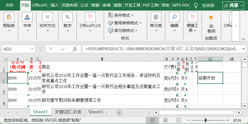 =IF(SUMPRODUCT(–ISNUMBER(SEARCH(关键词汇总表!$A$2:$A$4,M2)))>0,”延期开放”,”开放”)