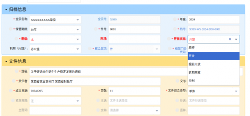 如果使用容易获得的计算机软件,在档案员自己的台式机上进行计算机辅助开放审核是不是可行呢?这是可行的。在专业档案管理软件中,开放审核一般在归档文件移交环节进行,如在元泰数字档案室软件中,档案员在归档页面对开放状态进行选择。